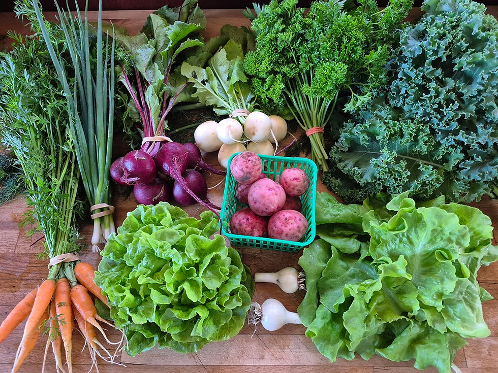carrots – first of the season! we're so excited. Don't forget that the top are so tender right now that they're very nice to cook with. Caitlin likes to make spanakopita with them .